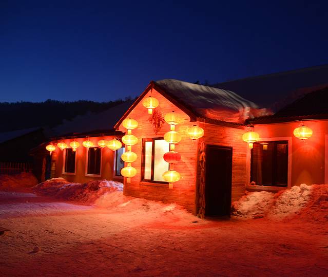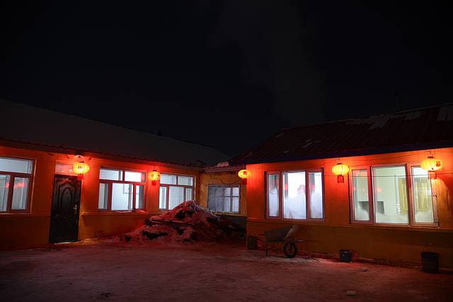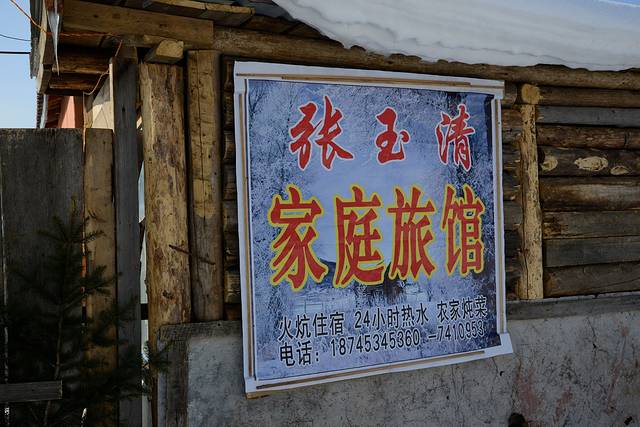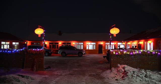折腾了30分钟,越走越不对头,手机也没信号。雪地里怕陷车,无奈沿着原路倒退回来,给旅店打电话,发现我们走错了路,应当按照日月峡水伊方水上乐园标志牌指示走,没多远就到了。我感觉这就是以前林场的家属区,日月峡属铁力管辖,我们住的是梦缘居快捷酒店,房间非常干净,温度高,穿单衣正好。住宿一张大床睡3个人没有问题,有独立的卫生间,价钱也不贵,100元一天。美中不足的是我们正赶上停水,对洗漱有些影响。