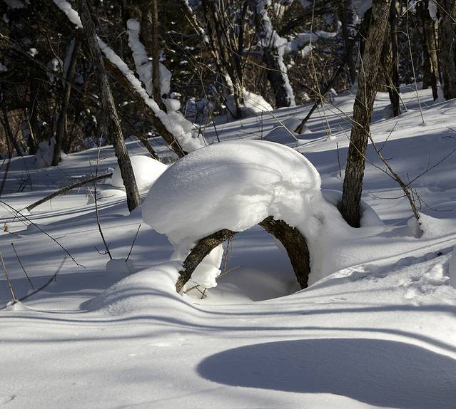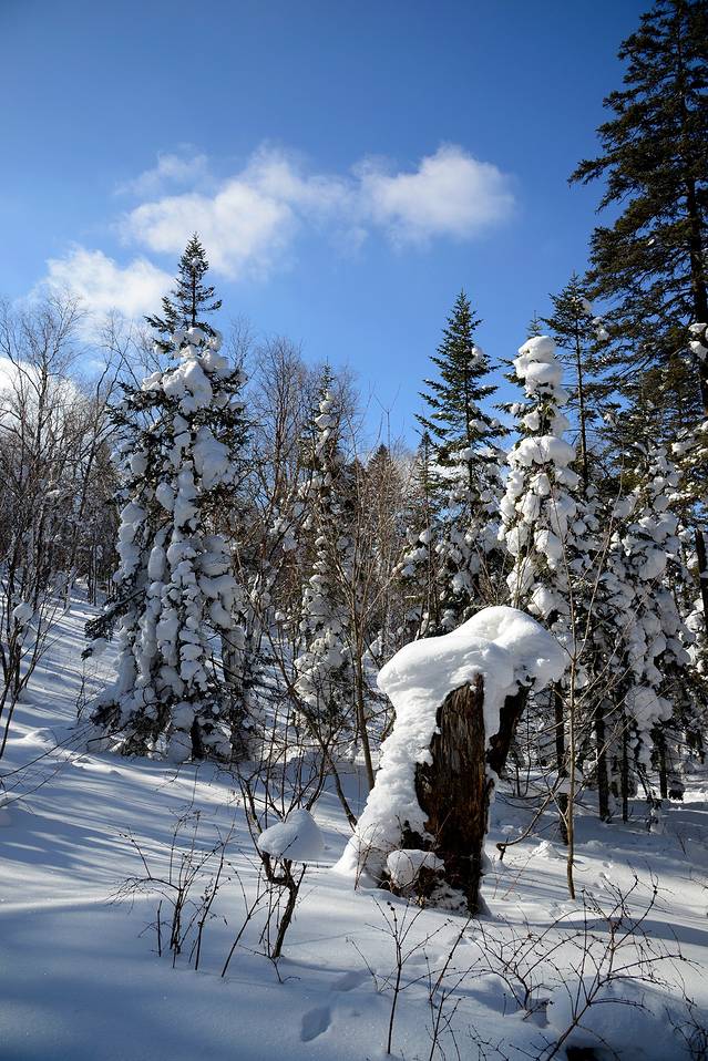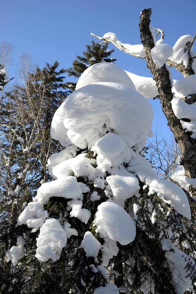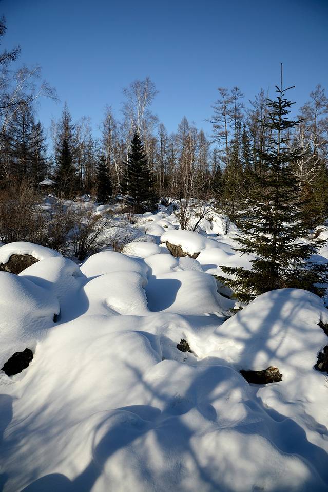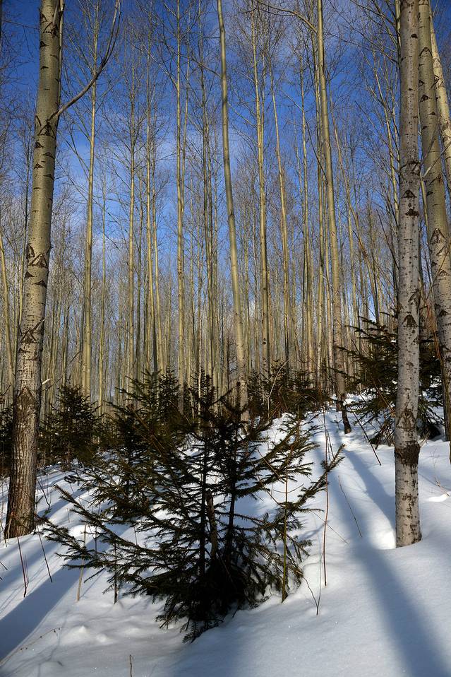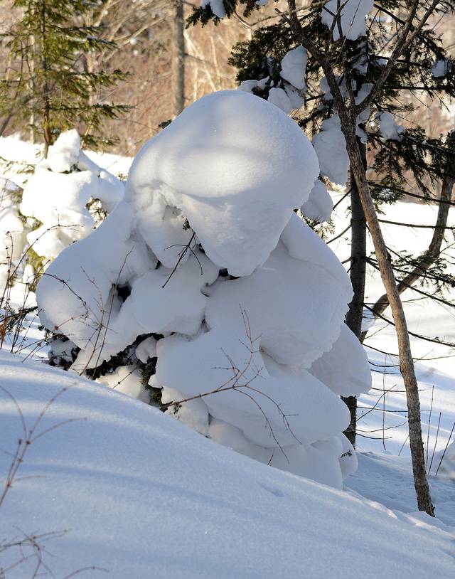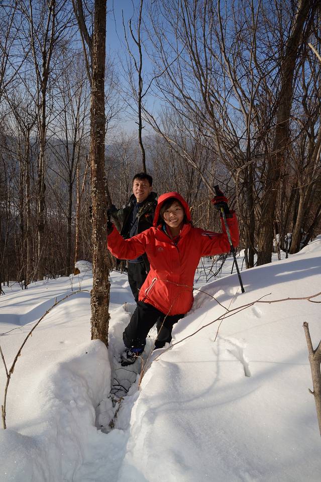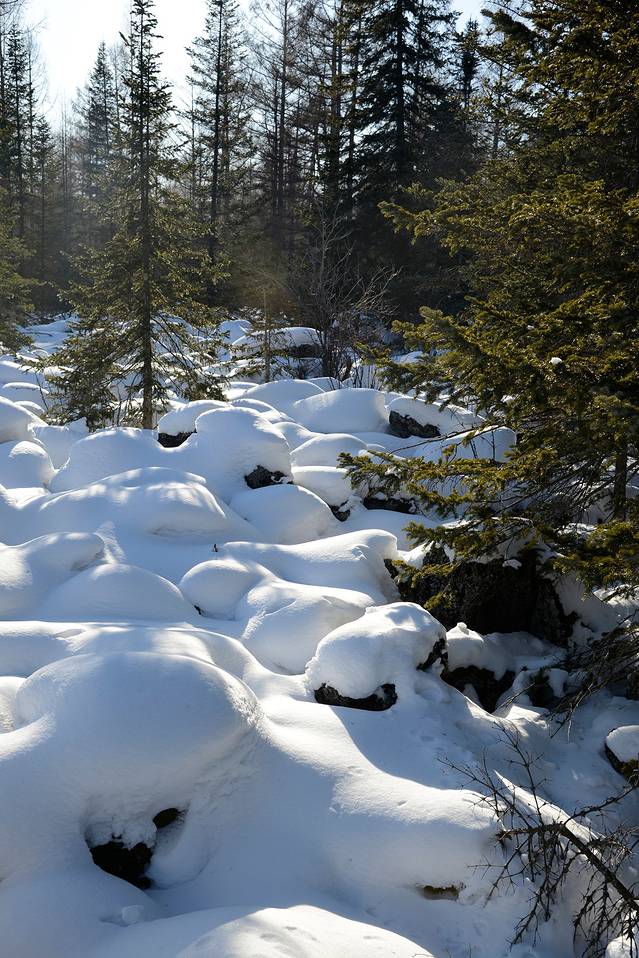 我们到对面的山上玩了一会儿。山上是一片松林,树枝上挂满了雪,一团团的,姿态各异。今天晴天,林中的光影也不错。松林中人迹罕至,雪也很深。我们往上走了几十米,再往上就没有路了。昨天刚玩过南沟,今天还是保存些体力吧!下午还要回哈尔滨呢!