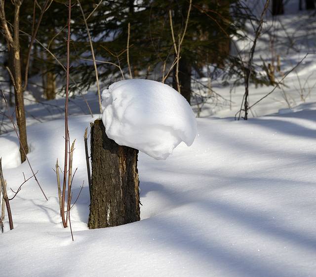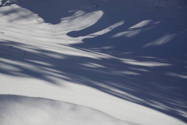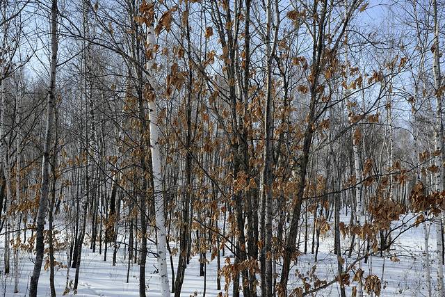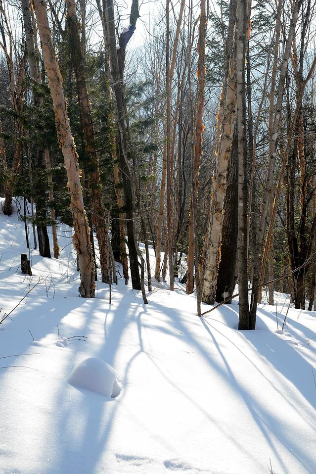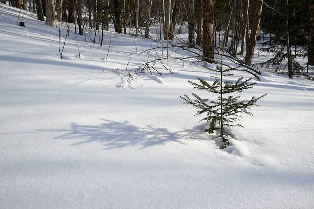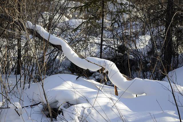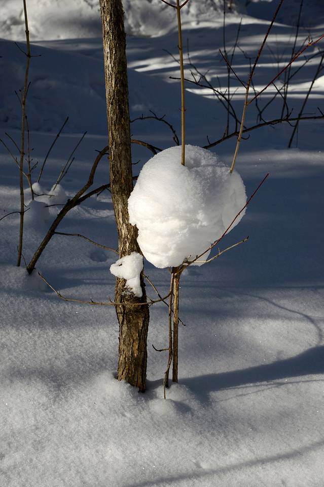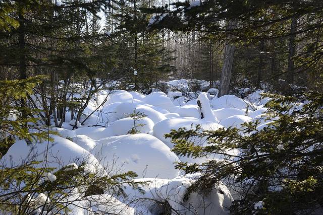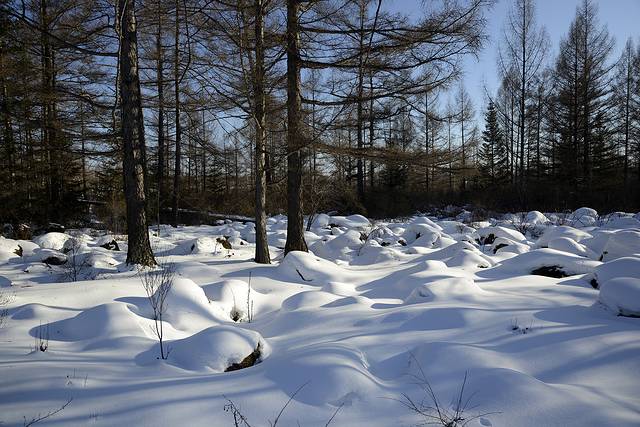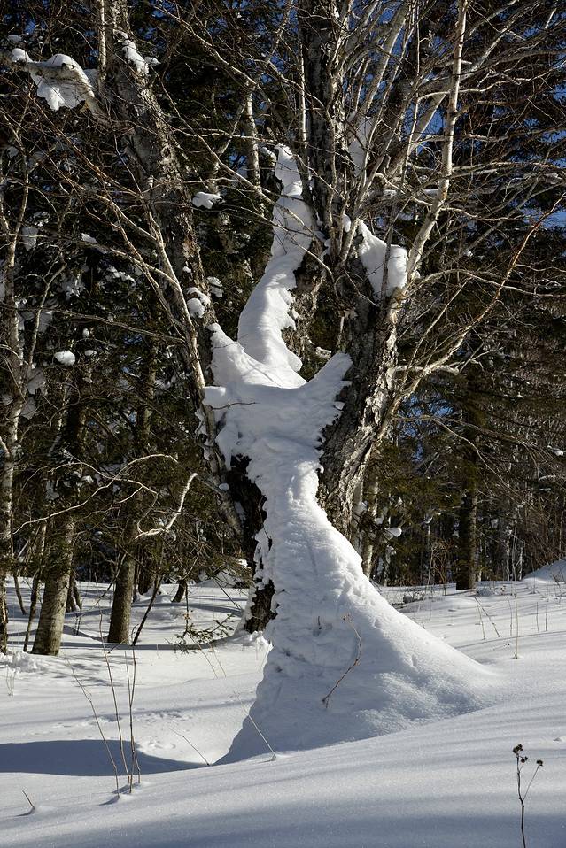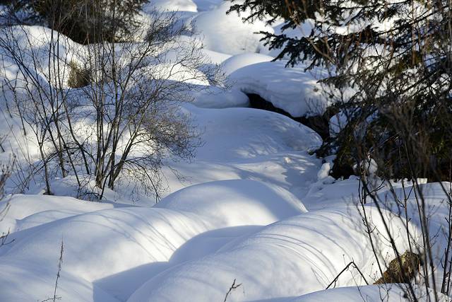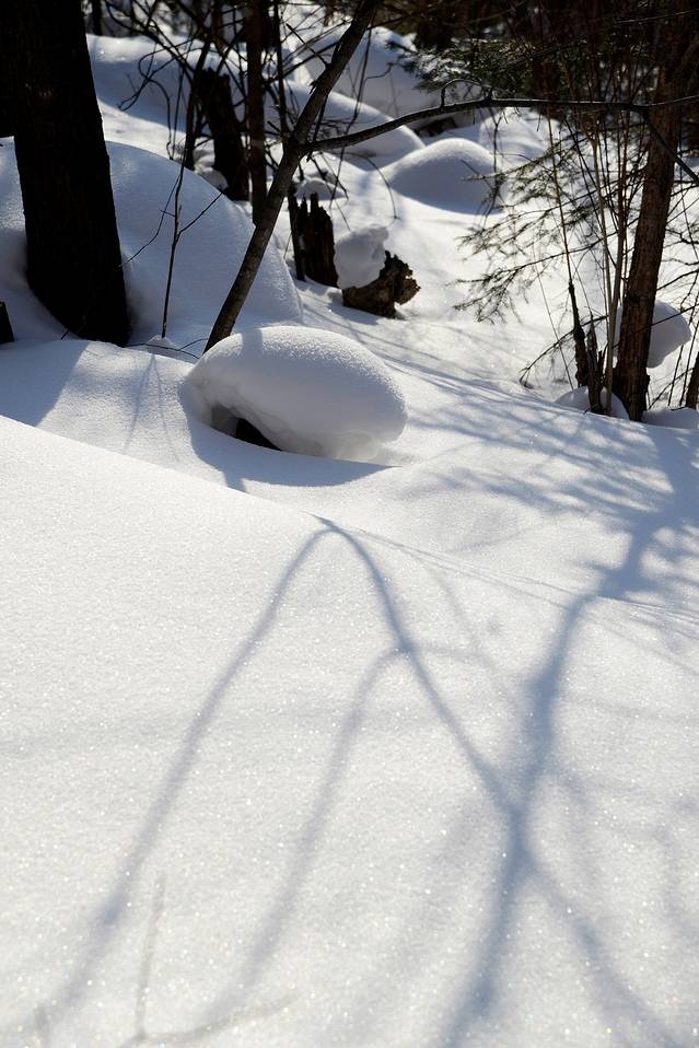 我们到对面的山上玩了一会儿。山上是一片松林,树枝上挂满了雪,一团团的,姿态各异。今天晴天,林中的光影也不错。松林中人迹罕至,雪也很深。我们往上走了几十米,再往上就没有路了。昨天刚玩过南沟,今天还是保存些体力吧!下午还要回哈尔滨呢!