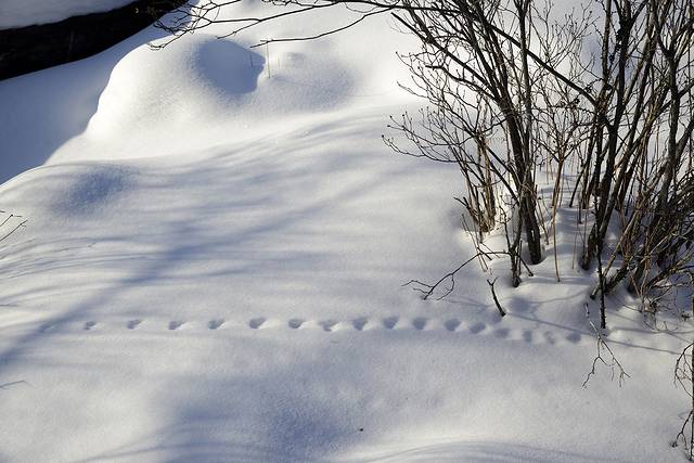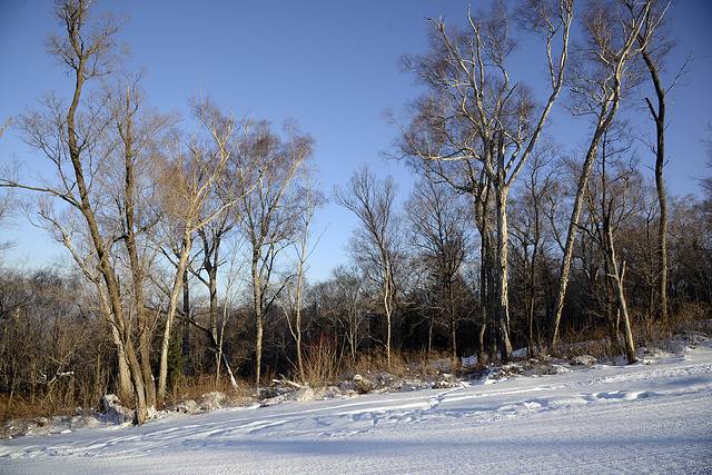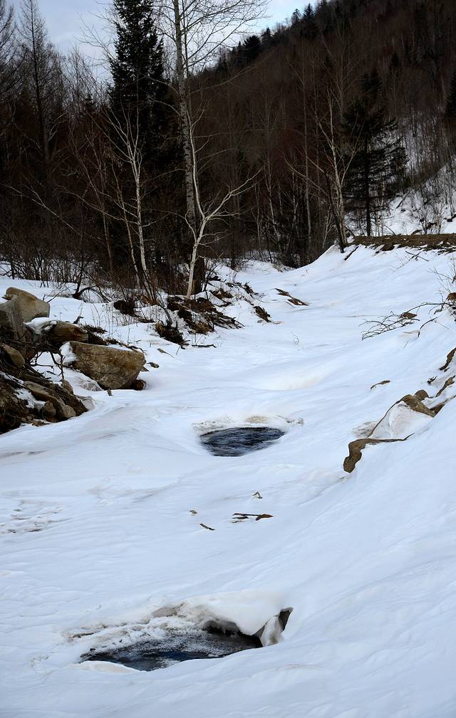 吃完中午饭在村子里随便转了转。午后的二浪河是一个相对比较安静的时间段,老客人走了,新的游客还没到。今年暖冬,向阳的地方雪化了不少,背阴的地方雪还很厚。2:00张老板带着我们去村子外转了转。有一条河从村子中穿过,这条河就叫二浪河,二浪河林场就以此得名。河面冬天结冰,冰面上打了很多洞,平常村里的饮用水就从这里打。