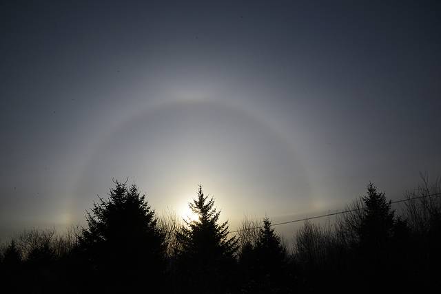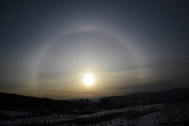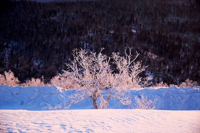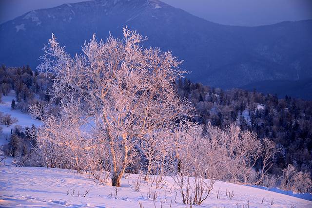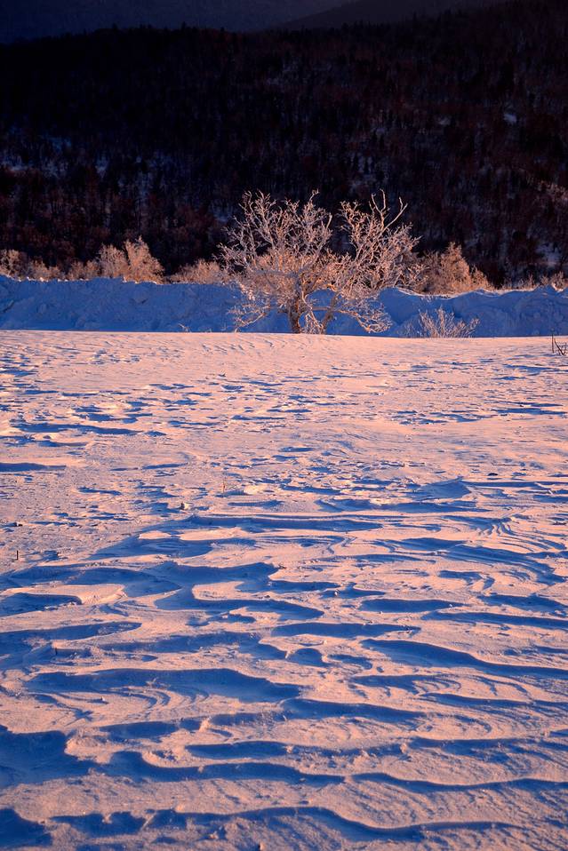 今天是个晴天,只是在山边有些云彩,太阳出来的稍微晚一些,大约6:40左右太阳钻出了云层,顿时雪地上一片金黄。山顶附近有一小片雾凇,在初升的朝阳下泛着些红光,晶莹剔透,十分漂亮。远处的山峰起起伏伏,风卷起积雪,时不时的飘过一阵雪雾,在逆光下很有意境。