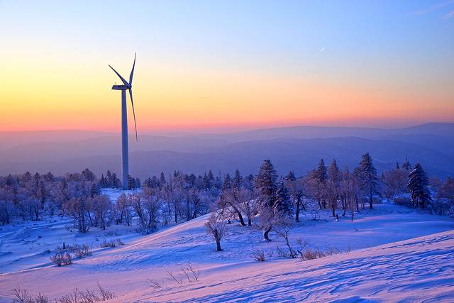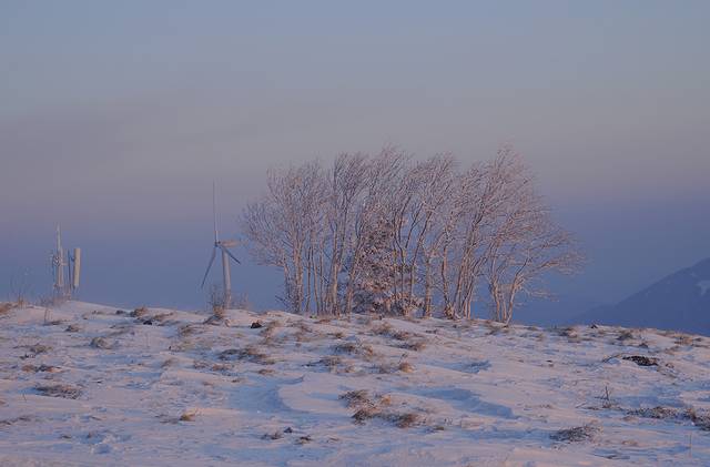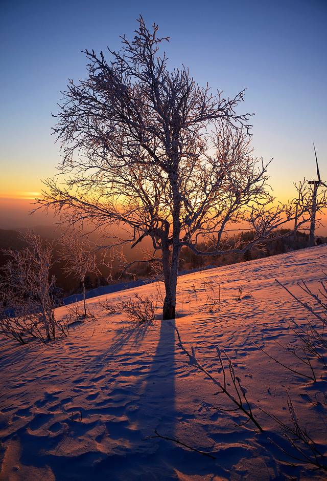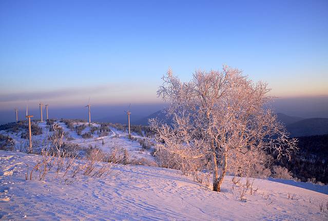 1、 风车山离二浪河大约30公里,冰雪路面,小心点开一般没有问题。这里是一个非常好的看日出的地方。山顶下面一点有几片很漂亮的雾凇。就算不为看日出,晴朗的日子来看看风景也是挺好的。