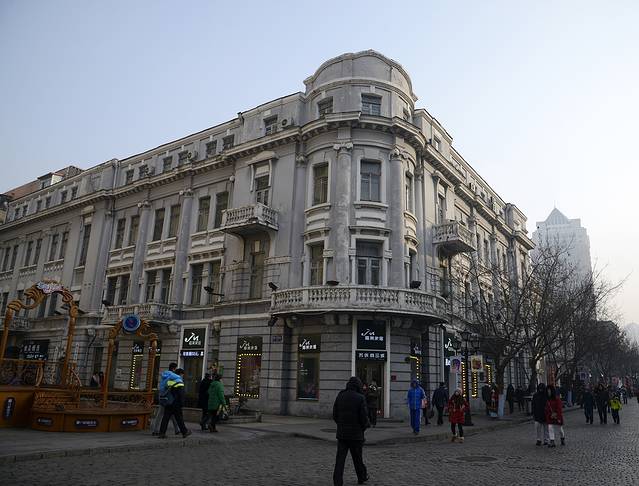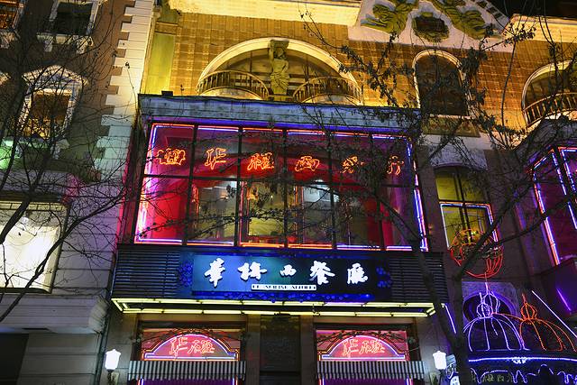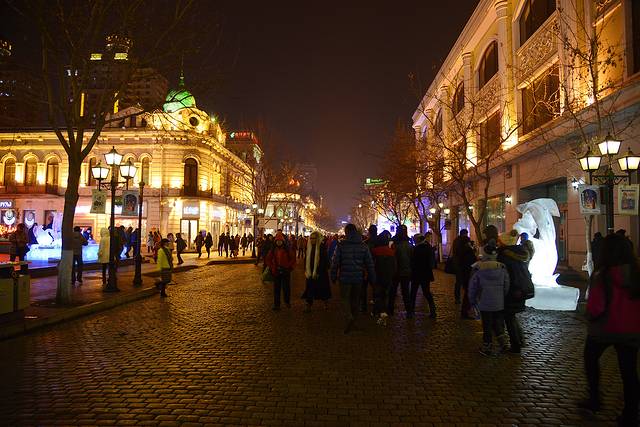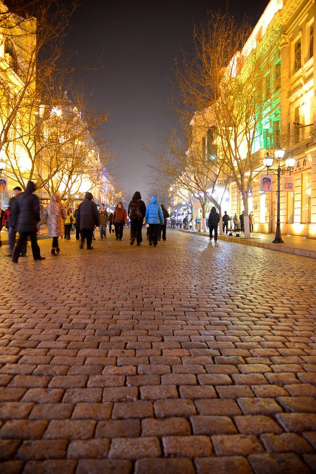 今天回来得早,我们决定再去中央大街转转。中央大街周围的路交通限制很多,7:14我们开到中央大街附近,里程表3119公里。我们把车停好,走路过去。夜间的中央大街比白天漂亮,灯火辉煌,流光溢彩,人也少一些。我们在秋林的门店又买了些红肠,娟娟又吃了根马迭尔冰棍。大家都满意而归。