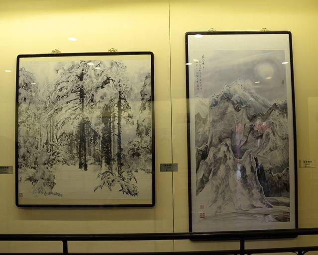 一层的展厅在重新布展,我们没看到网上说的著名艺术大师潘天寿的作品和“北大荒”版画早期的代表作。一层倒是有一个“于志学艺术展”,主要是绘画,挺漂亮的。于志学先生是冰雪山水画创始人,我们对绘画是外行,看个热闹而已。