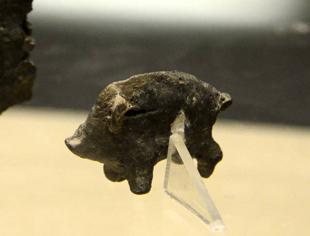 小陶猪:新石器时代,黑龙江省宁安市莺歌岭遗址出土。为手捏,造型逼真,姿态各异。其中一头猪背脊高耸,躯体稍瘦四肢短小,前肢占有较大比例,带有明显的野性。显得异常活泼,应是刚被人类驯养不久的野猪,是野猪向家猪过渡的品种。莺歌岭陶猪的出土,印证了当时人们处于定居的农业社会状态中。