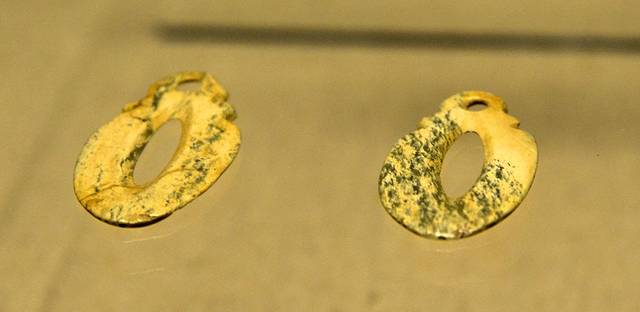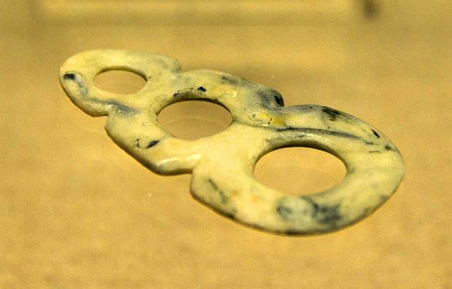 三联玉璧:黑龙江省尚志市亚布力遗址出土,整体似三个玉璧串联而成,璧孔均呈椭圆形,内外皆有刃,两面加工,是一种佩饰。同类器物在红山文化中也有发现。