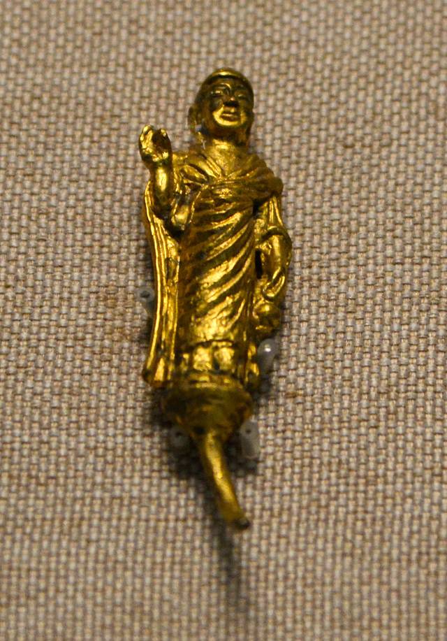 唐渤海国金菩萨造像:黑龙江省宁安市渤海上京龙泉府遗址出土。造像上身穿半披式袈裟,左手提净水瓶。整体形象端庄恬静,极具神韵。以往唐代佛造像的样式,大多是自然敞开下垂的,因此佛像的胸部和腹部多是坦露的。而这尊佛像全身穿戴齐整,在唐代造像中并不多见。这件文物也是目前在渤海国上京龙泉府遗址内发现的唯一一尊纯金佛教造像,具有极为重要的历史研究价值。