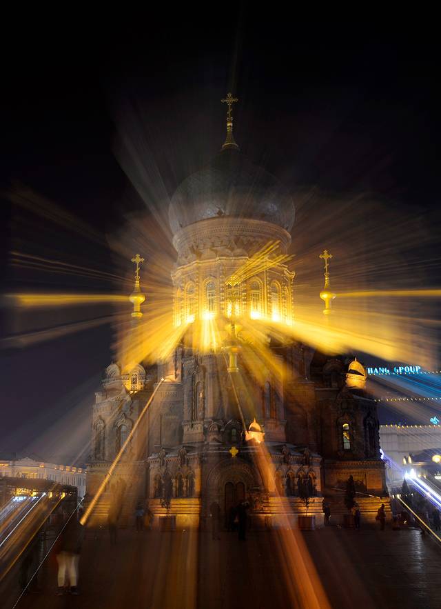 回到车附近才8:20。我一直想去拍索菲亚大教堂的夜景,看着直线距离才300多米,觉得开车过去拍几张照片也不耽误多少时间。没想到按着GPS的导航,转来转去,总是走不对路。感觉中央大街附近的路况比较复杂,交通限制也多。最后绕出去4公里,开了20分钟,8:40才到圣索菲亚大教堂,里程表3123公里。