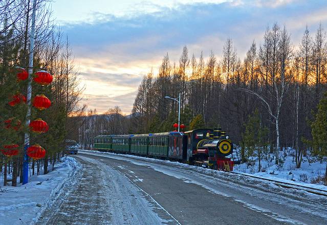 4、 亚布力滑雪场旁边的青云小镇,有一辆窄轨小火车,运气好可以看到小火车运送滑雪的客人。