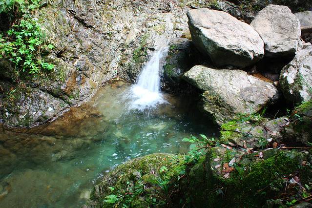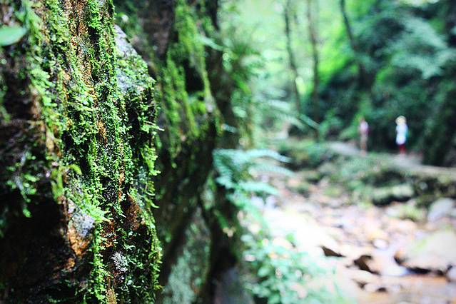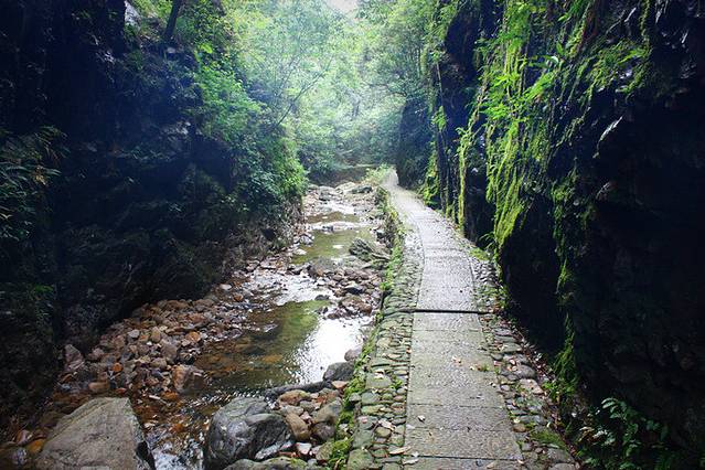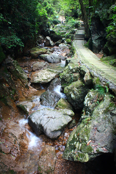 峡谷虽然也离不开水,但与之前看到的五泄截然不同,气势与轰鸣是没有了,走在湿漉漉的山道,头顶绿叶遮盖,身边溪流潺潺,空气清新得让人都不习惯。