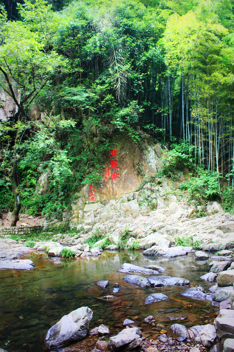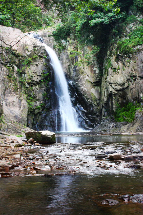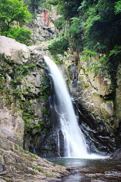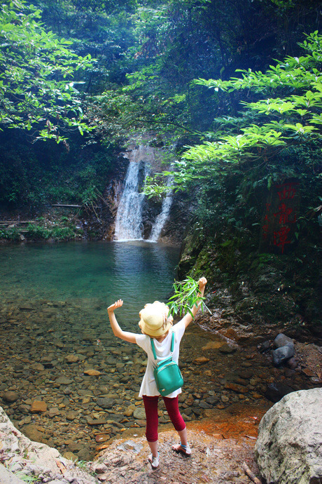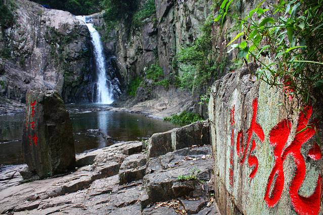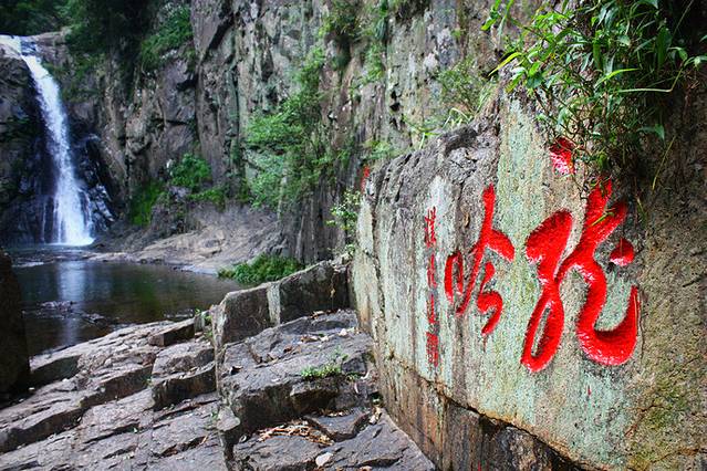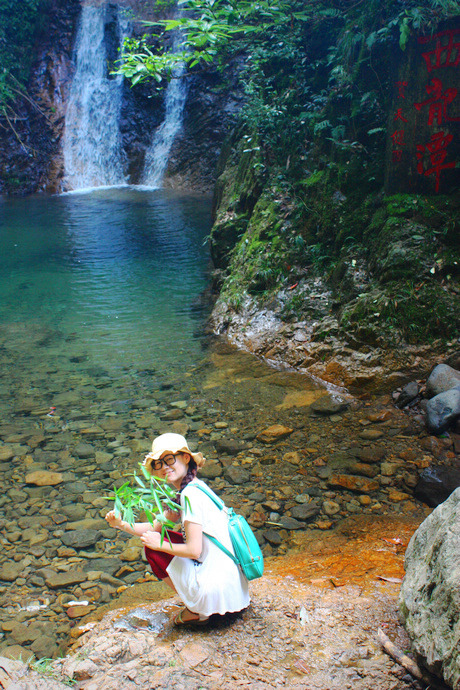 沿山向北,不过几里,正沉醉在一片清凉的绿意中,忽闻山谷里瀑声回响,猜想必是久闻未见的第五泄,忍不住要一睹其容颜,狂奔至东龙潭,瀑布从三十多米高的崖口喷吐而出,潭水四周石壁上可见众多古人的题刻,想必古人的心情也隐于这岩崖间。