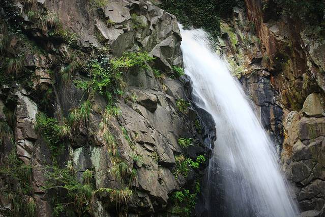 从31.2米的悬崖上狂奔而下,声似雷滚,形如巨练,震山撼谷,喷珠撒玉,生云起雾,神态百出,宛如蛟龙出海。飞瀑冲激所成之潭称为“东龙潭”,潭周林郁,峻壁蔽日,深不见底,俯视成黯黑色。