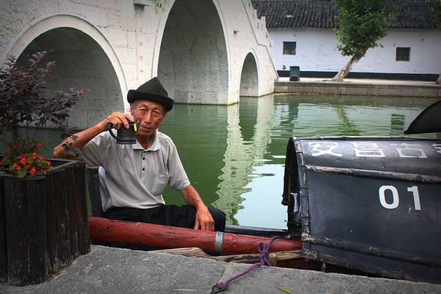 轻轻的,一艘乌蓬船靠到岸边,头戴乌毡帽的老大爷仰着被岁月侵蚀的脸,邀我们上船。来过绍兴,没乘过乌蓬船,是否太丢脸?
