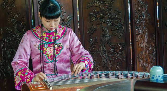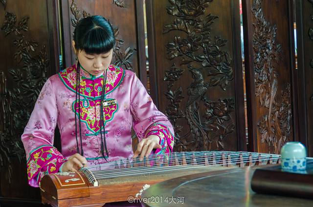 刚进入景区,就听见旁边的厅堂内传出来悠扬的古筝声,原来这里是一座茶室,游客可以进来喝茶,也可以点一首曲子让姑娘弹奏,这些姑娘多才多艺,能做讲解员,也要演奏各种乐器。