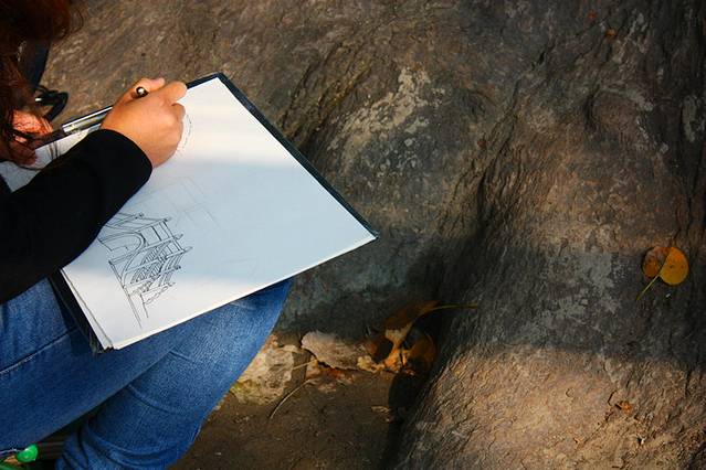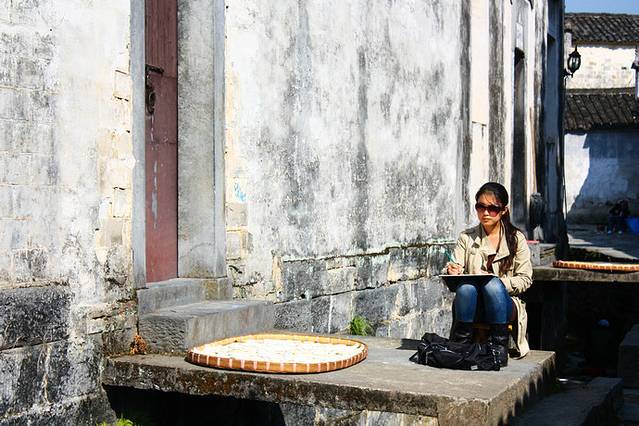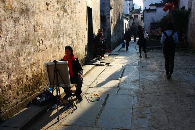 清晨太阳刚刚升起,就有一些勤奋的美院学生起早写生,直至摩肩接踵、遍地皆是,十分壮观^_^在西递。