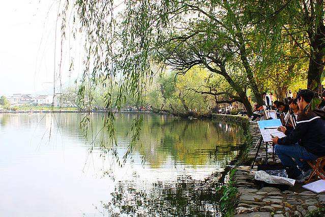 南湖边到处是写生的学生,她们也是宏村一道流动的风景。年轻,真好;追求艺术,真好。真羡慕,我的青春已开始远去,悄悄地走了……