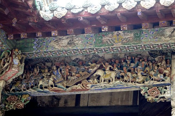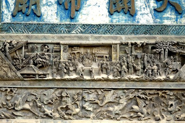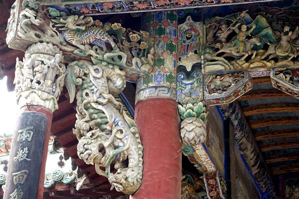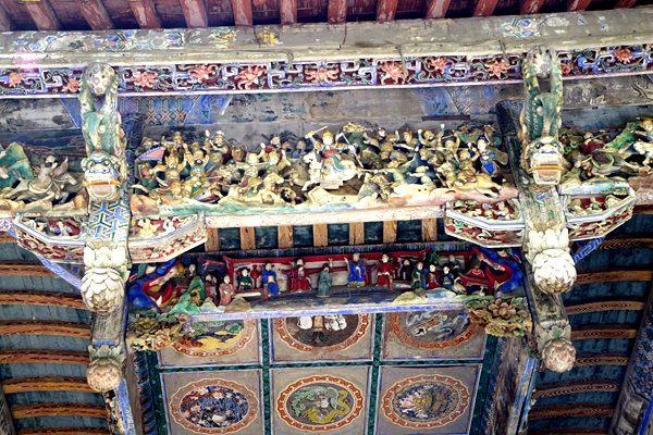 花戏楼有"三绝",一绝是正门前这两根铁旗杆,每根重12000斤,旗杆高16米多,直插碧空白云间。花戏楼的第二绝在山门。花戏楼山门是一座仿木结构的三层牌坊式建筑,上面镶嵌着闻名天下的立体水磨砖雕,玲珑剔透,琳琅满目。花戏楼的第三绝是木雕 。花戏楼的木雕分为普通木雕和大木透雕两种。