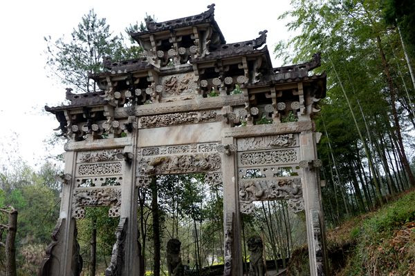 纪念牌坊建成于1932年底,四楹三间,相传为北京昌平原清朝咸丰重臣肃顺墓前的石料改制
