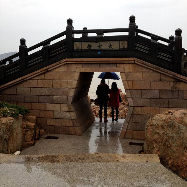潮音洞 在普陀山 紫竹林 景区内、龙湾之麓,距停车场仅200米。“潮音洞”这个名称其实是一语双关,一方面因洞穴日夜吞吐海潮,声若雷音;另一方面借“潮音”比喻“佛音”,洞口日夜浪涛不绝,声如观音讲经说法,又如千僧诵经,妙响洗尘,故名。潮音洞为山石裂隙所成,从崖至脚高数十米,半浸于海中。洞有二门,通明如天窗,潮水奔驰入洞,浪石相激,声如轰雷。涨潮时倚岩俯视,仿若蛟腾足下,险怪百出,声若雷鸣;晴天时洞内七彩霓虹闪现,蔚为奇观。是为普陀山十二景之一的“古洞潮音”。