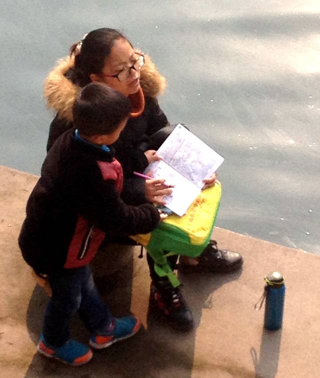 剡溪边辅导孩子学习的母亲。一可以晒冬日的暖阳,二与美景做伴,三是辅导了孩子的学习,