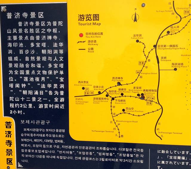 普济禅寺游览次序:海印池(御碑亭、观自在菩萨墙)——山门 ——御碑殿——钟鼓楼 ——天王殿——大圆通殿(毗卢观音圣像、32座观音应身像)——法堂 ——方丈殿——功德殿——斋堂、僧舍