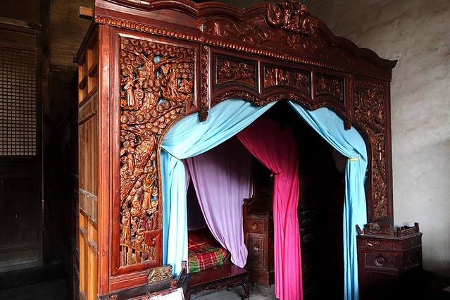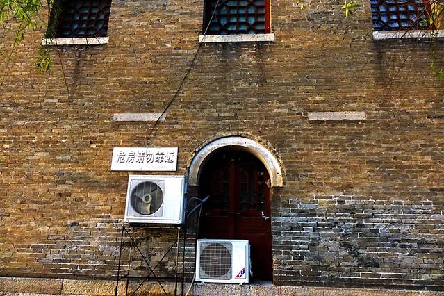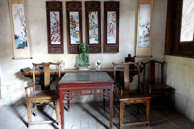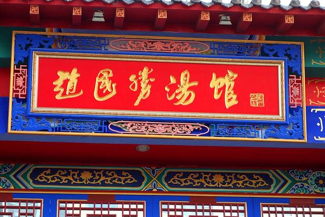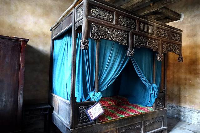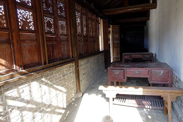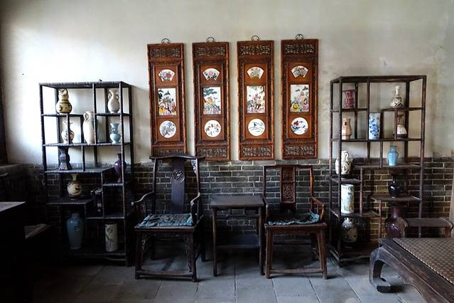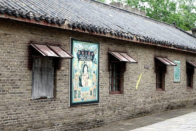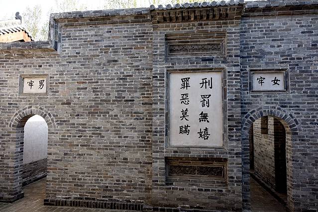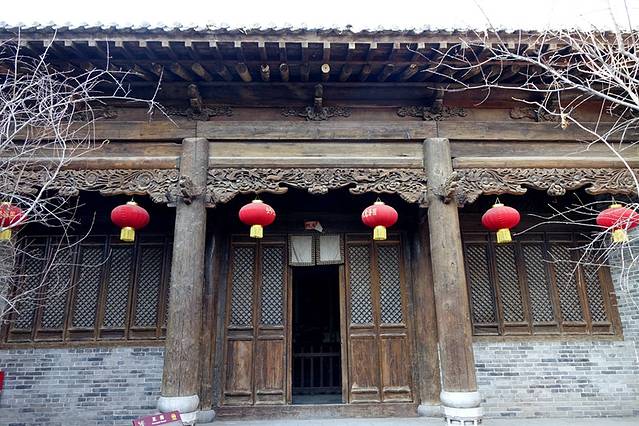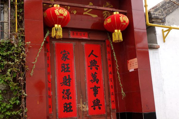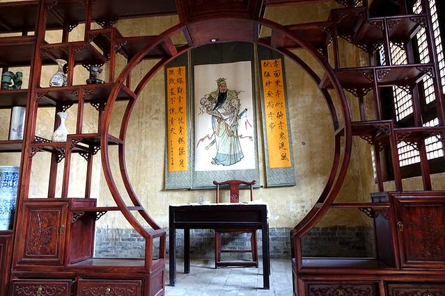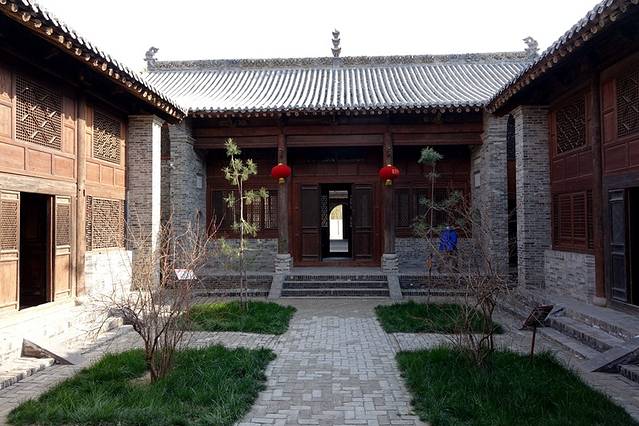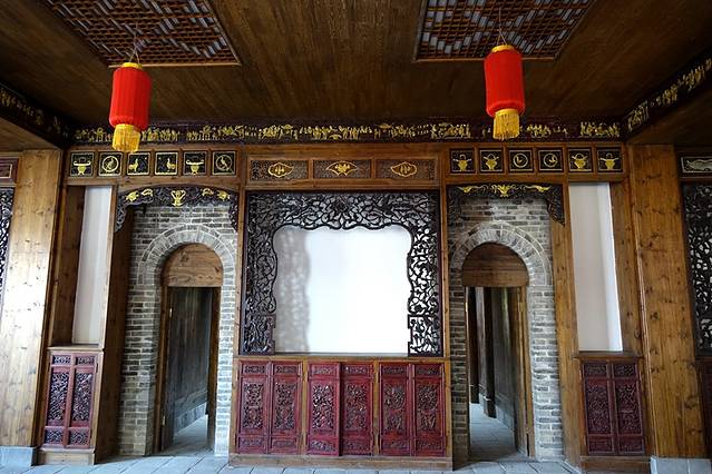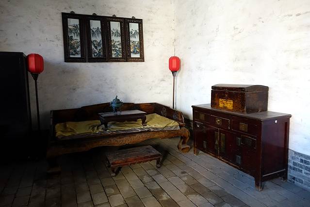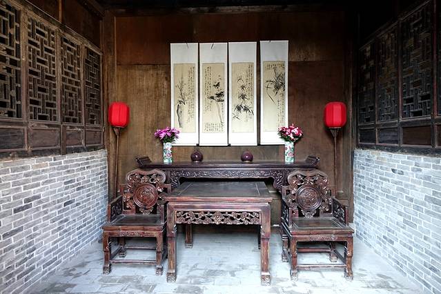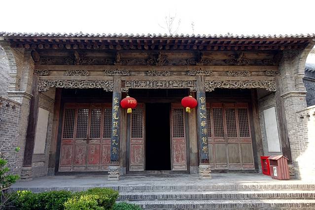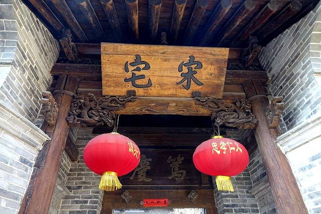 门两边这幅对联:上联是“与国咸休安富尊荣公府第”,“富”字缺上面一“点”,寓“富不到顶”,下联为“同天并老文章道德圣人家”,“章”字一竖直通“立字”,寓“文章通天”。 相传是清人纪昀(纪晓岚)的手书。