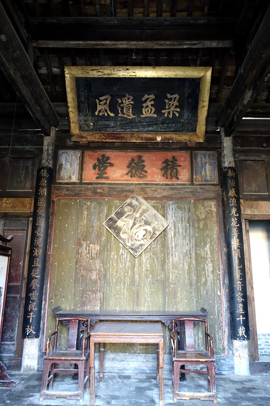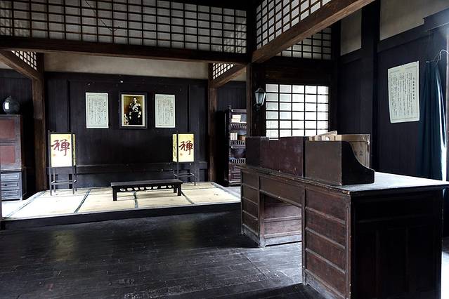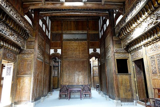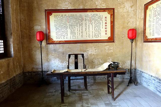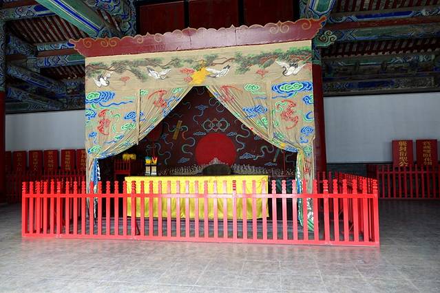 过重光门,就是大堂了。是历代衍圣公处理公务的地方。大堂中央有一绘流云、八宝暖阁,正中的太师椅上,披铺一张斑瓓虎皮,椅前狭长高大的红漆公 案上,摆着文房四宝、印盒、签筒。