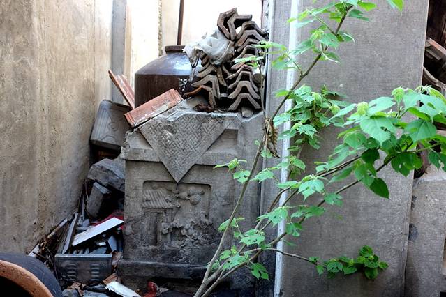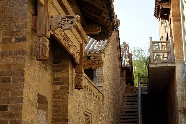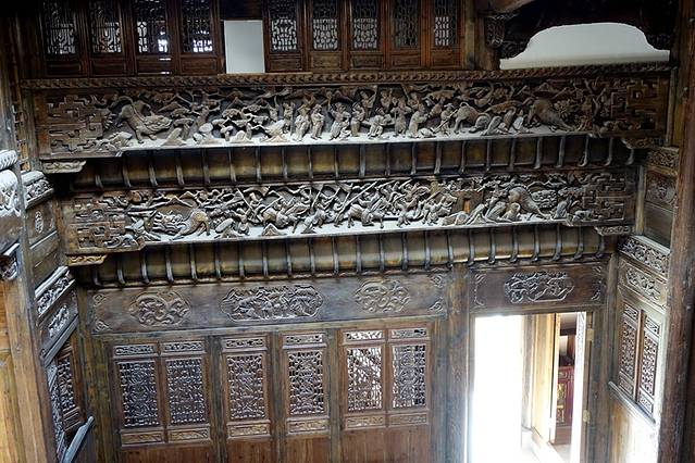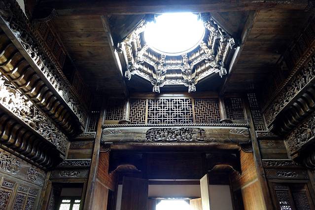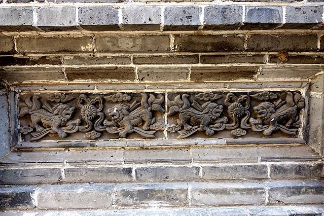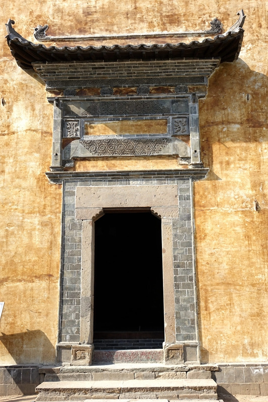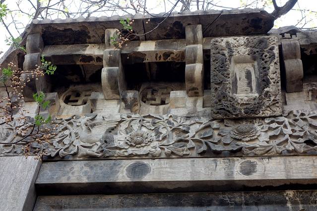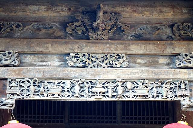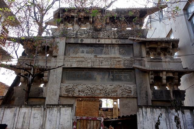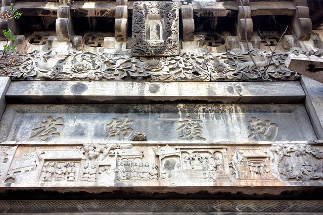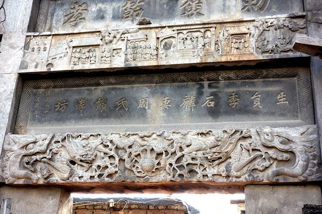 此坊六柱五门,飞檐起脊,三层横梁,房顶呈瓦垅状。