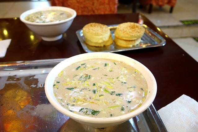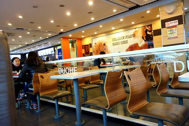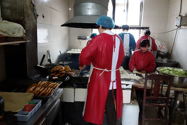 早上, 在“多禾馅饼”吃早餐。这个饭店是连锁店,有很多家,饭量小的推荐在这吃中、晚餐,因为是半自助式的,菜都是一次性做好,然后分份打的,并且还可以每样要半份,只是菜的量小,我们两人每餐要吃三份菜。