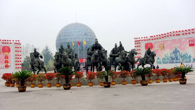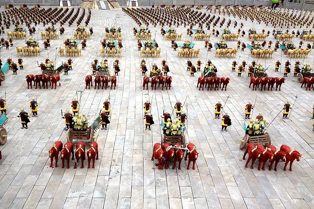 主要再现了周天子时期宏大的阅兵场面。有各种形态的仿古瓷塑人5334樽,战车200辆,战马近千匹,炮车上百乘,各类兵器、仪仗36000多件。