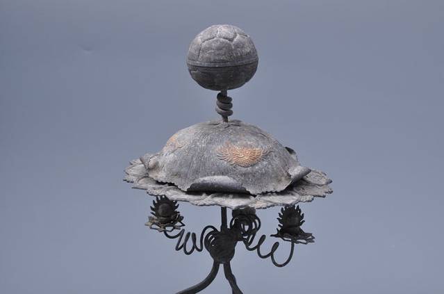 J1六角形四级佛塔1座。通高54厘米,底直径17厘米,重1592.6克。装饰图案以鸟兽纹为主,佛塔每级饰有一尊佛像,周边纹饰为四大天王像。