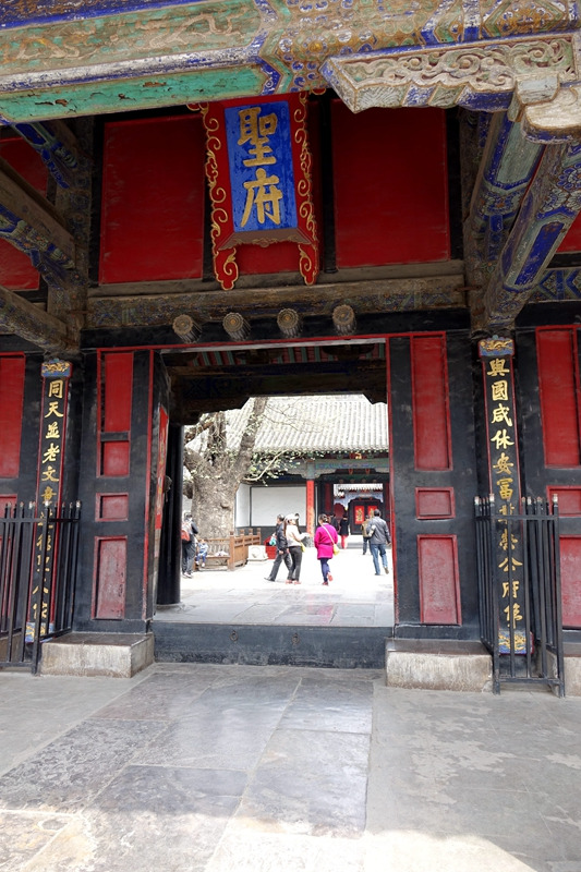 孔府大门上方高悬蓝底金字“圣府”二字,相传为明相严嵩手书。