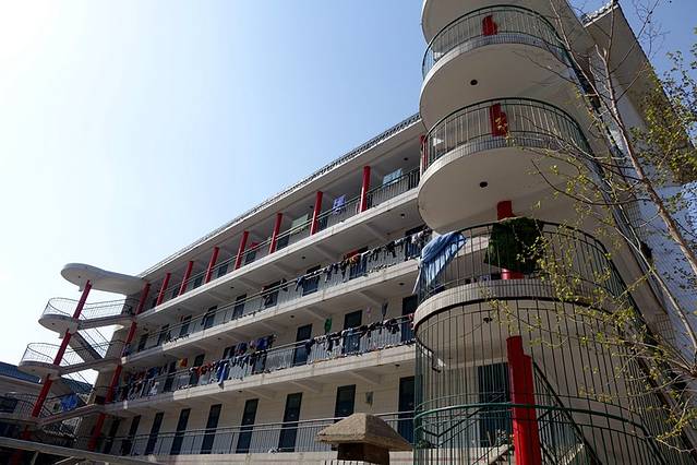 青色调的外墙,民国风的檐壁与门廊,外有拱门,内有栈桥,漫步碧水与绿树环绕中,让人身心愉悦。
