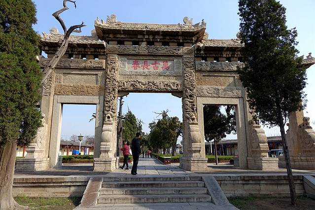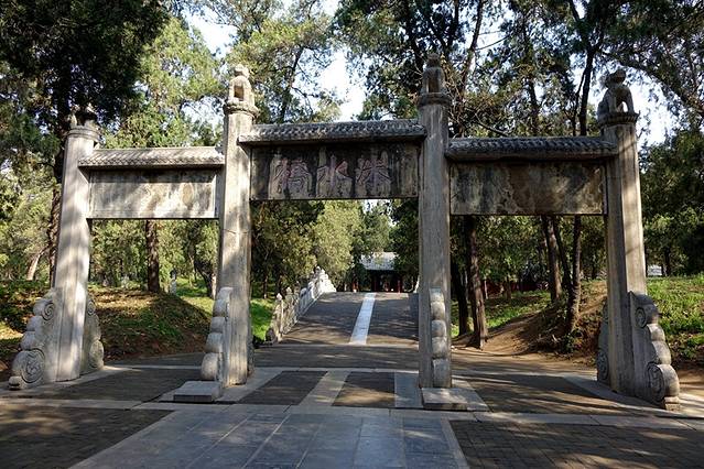 到了孔林,首先看到的是万古长春坊。是中国著名的牌坊之一。这座牌坊建于明万历二十二年(1594年),清雍正年间重修加固。整个石坊气势宏伟,造型优美。是曲阜现存最大、最精致的石牌坊。