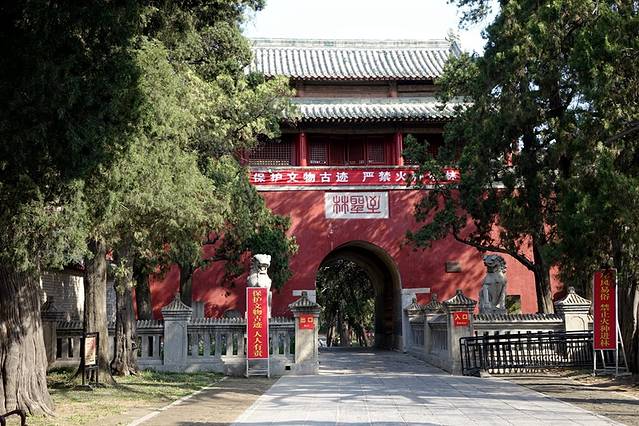 孔林的第二道大门——至圣林门楼,人们习惯上称其为“二林门”,简称“二门”,为一座城堡式的建筑,亦称“观楼”。四周筑墙,墙高4米,周长达7000余米。二林门分上下两层,下层为五间重檐砖质城堡式拱门,两扇朱漆大门上各镶嵌着横九竖九共81个团花形铁门钉,这是孔子地位最为尊贵的象征。拱门上横嵌石匾,篆刻“至圣林”三字。此门建于元至顺二年(1331年)。通过二林门,才算正式进入了孔林。