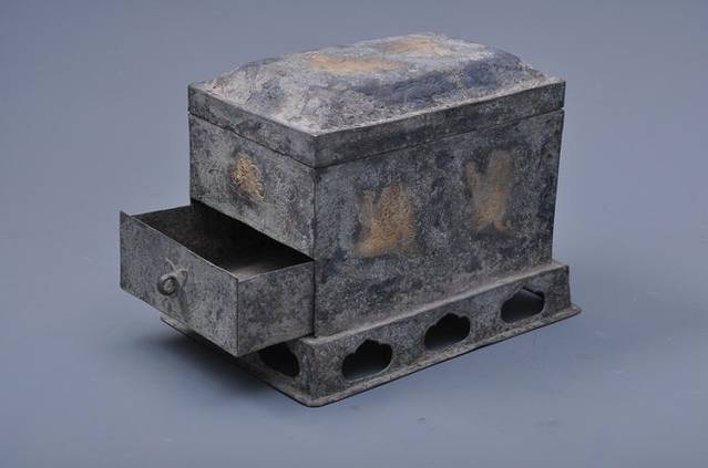 J7方体箩子1套。通高12厘米,长15.8厘米,宽11.1厘米,重557.7克。皿形为长方体,由盖、罗、屉、罗架、皿座组成。两侧有相对跃马形象,方体箩字的上盖及两侧正面均有骑凤凰仙人形象,表现了道教或汉地传统信仰题材。
