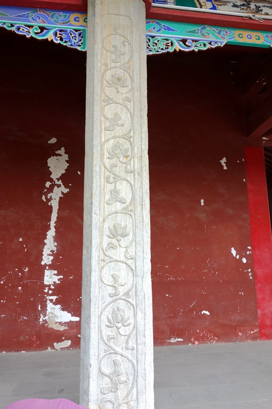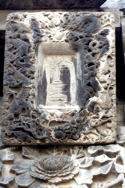 石柱前后用石抱鼓,鼓上浮雕石狮子,两侧面上分别浮雕龙、鹿、牡丹等图案。
