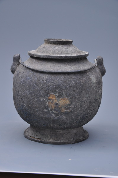 J16提梁盖罐1个。通高15.5厘米,底直径10.4厘米,口直径9.3厘米,重406.3克。通体饰蔓草纹,鹦鹉装饰和精美典雅的卷面番莲纹;