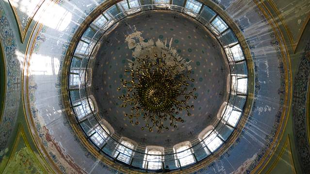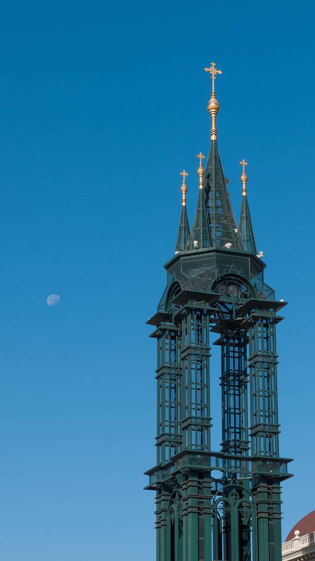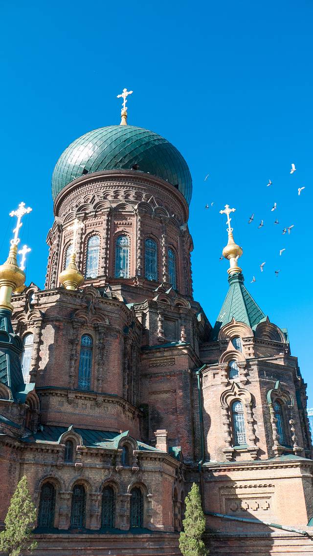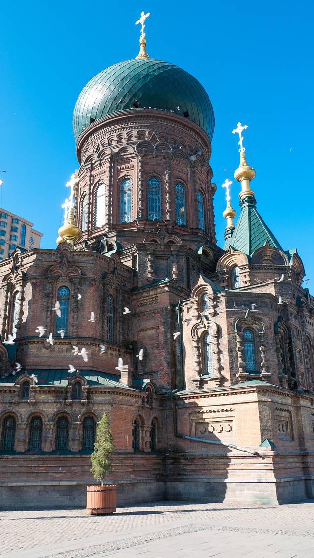 索菲亚大教堂是目前中国保存最完美的典型拜占庭式建筑。可惜的是,教堂门前的广场都是卖手机的临时摊位,周围高楼也很多,是教堂的神圣感瞬间降为0。