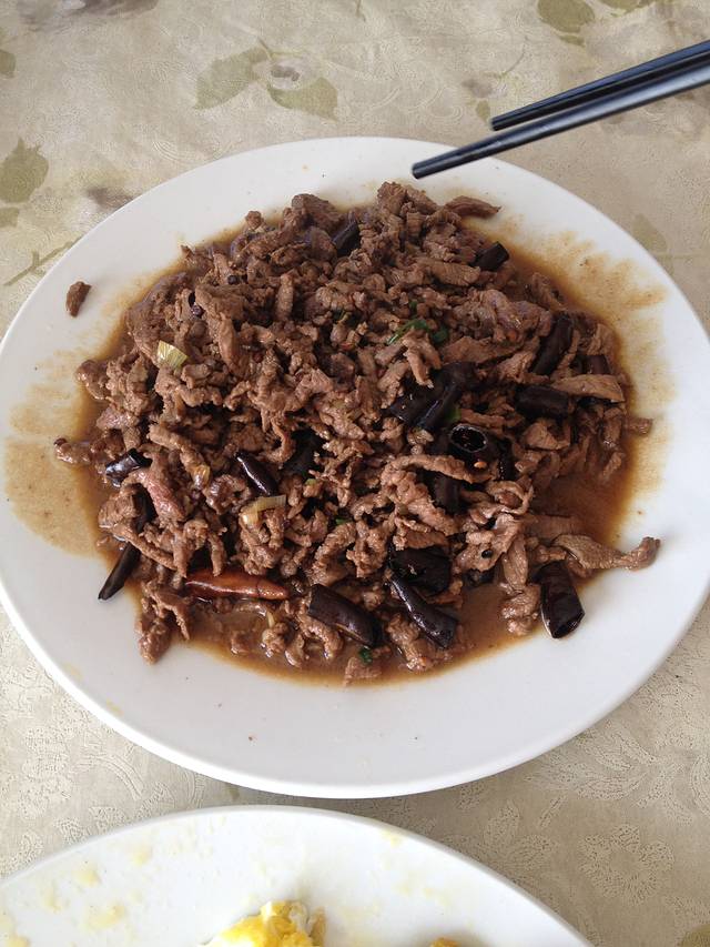 辣炒狍子肉,老板娘第一次做,都不会切丝。。。这菜还是老妈亲自抄刀下厨做的呢~~ 我们也是第一次吃狍子肉,没有什么特殊的怪味,就是觉得肉很嫩,好吃!