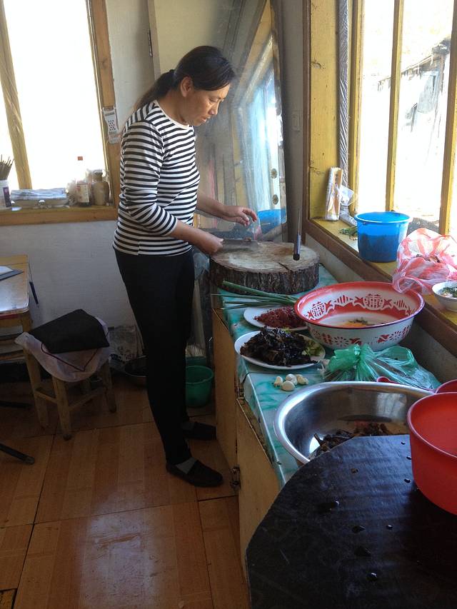 接近中午,我们开始寻觅饭店。先是在右手边看到一个饭店招牌,开了一会发现左边山上貌似有个农家院。我们决定先拐上去看看。上去后发现景色绝美,便决定就在这家吃。店里只有我们一桌客人,就跟老板娘在厨房翻腾,看有什么可以吃的东西。。。(因为淡季,所以店里备的吃的东西不多)跟老板娘唠了好一会儿,才跟我们说有狍子肉。这袍子肉还是今早他家大狗在山上发现咬死拖回来了,百年不遇,能吃到新鲜的狍子肉,我们超幸运的~~~