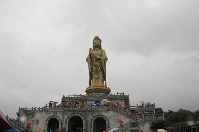 观世音菩萨庄严像。朝拜的人很多,香火也很旺。又赶上小雨,让人想起观音菩萨洒甘露度众生。