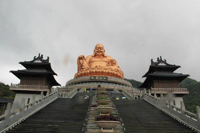 到了溪口风景区,确实很漂亮,可惜的是天公依然不作美,还是下雨下雾。景区内是弥勒菩萨的道场,道场内也是庄严无比。大大的布袋和尚笑得无比和蔼,笑迎天下客!下午看完了雪窦山又赶往了绍兴。