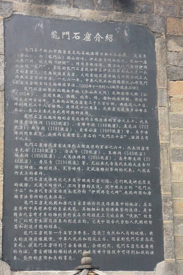 开凿于北魏孝文帝年间,之后历经东魏、西魏、北齐、隋、唐、五代、宋等朝代连续大规模营造达400余年之久,南北长达1公里,今存有窟龛2345个,造像10万余尊,碑刻题记2800余品。其中“龙门二十品”是书法魏碑精华,褚遂良所书的“伊阙佛龛之碑”则是初唐楷书艺术的典范。龙门石窟延续时间长,跨越朝代多,以大量的实物形象和文字资料从不同侧面反映了中国古代政治、经济、宗教、文化等许多领域的发展变化,对中国石窟艺术的创新与发展做出了重大贡献。