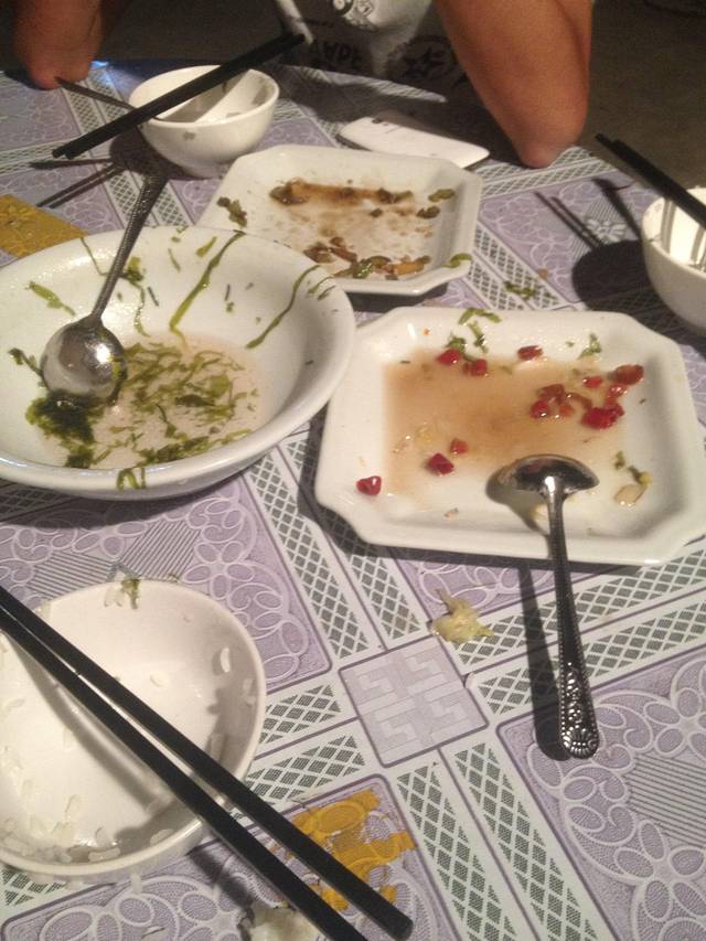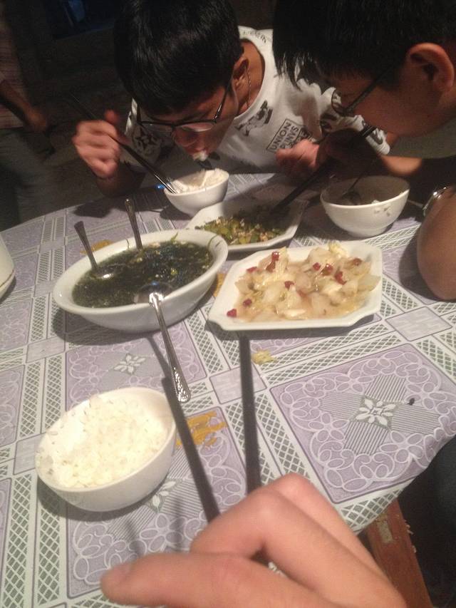 晚饭吃到了米饭..煮了一个大白菜和一碗紫菜汤 这些紫菜是海产品自家有的。别的蔬菜都要岛外运回,也不怪收费偏高点了每天客流量不大有时一天也没做生意关键要说的是老板娘看我们可怜又给我们上了个青椒炒蛋最后也只收了我们50.看那光溜溜的碗儿,你说我们容易嘛。