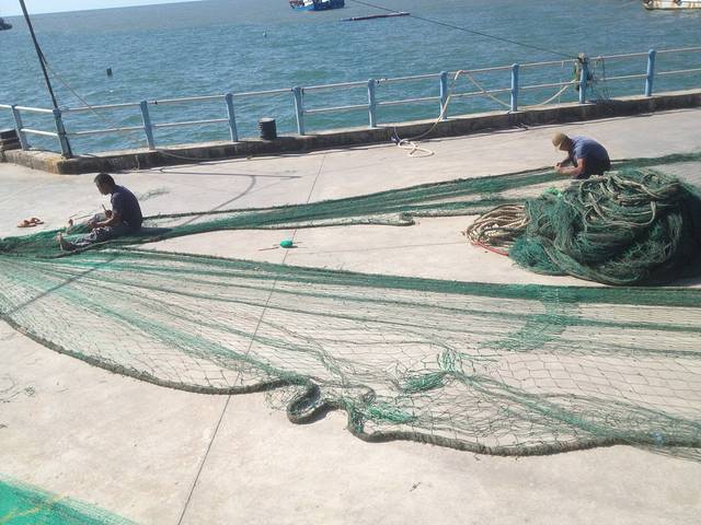 织渔网的渔民。