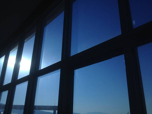 从候车厅的玻璃窗内拍的码头景。