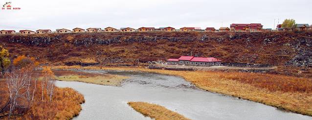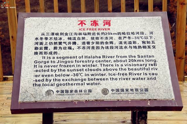 进入景区后不久,看到第一个观景台,写着关于不冻河的介绍。不冻河为哈拉河的一段,此段河水即使在极其寒冷的冬季也未曾冰封,故其名为不冻河。当别的河流在严寒下冰封沉眠时,它却依旧流水潺潺,“不冻河”之所以产生,是由于该河段附近有大量的地热存在的缘故,在-40℃以下的气温,河水不但不会结冰,水中还生长着水草,河面上冒着腾腾热气,透着夕阳的余辉,流光异彩,极为壮观。