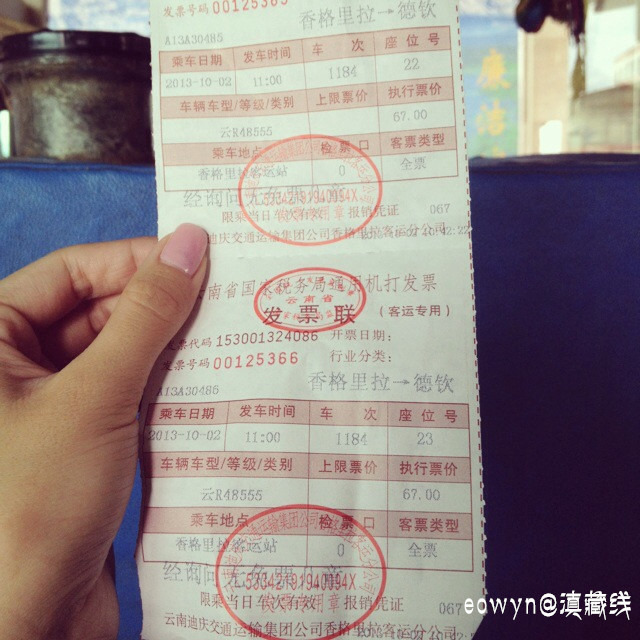 行:为了节省路上的时间,决定坐夜车赶到香格里拉。从昆明客运西站(0871-5326258)坐20:30发车的那趟,票价212,路上需要12个小时左右,司机师傅半夜要睡3个小时。差不多第二天11左右抵达。打114可以异地订票,当天再去客运站取票就行。除了20:30的,还有19:00和20:00的,貌似现在班次很多,尤其是小长假这种时候。
