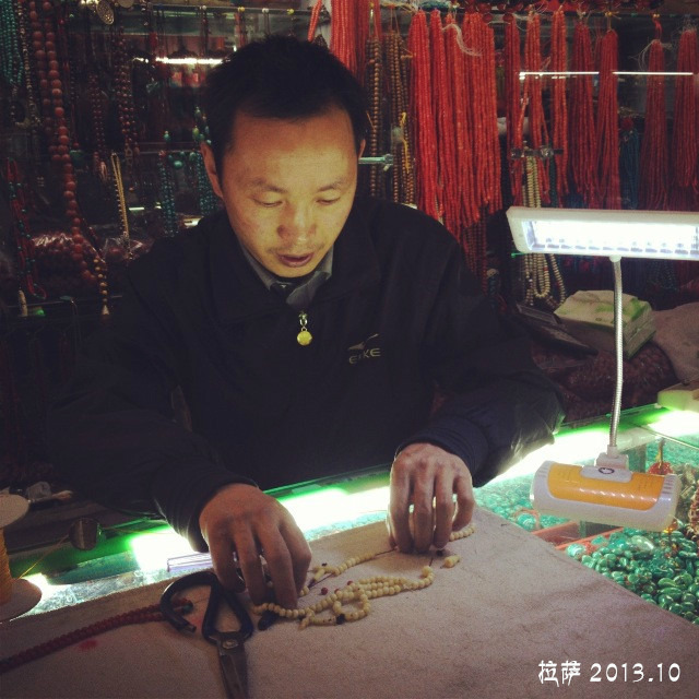 先是在一个女老板的柜台前问了问有没有牦牛骨的佛珠